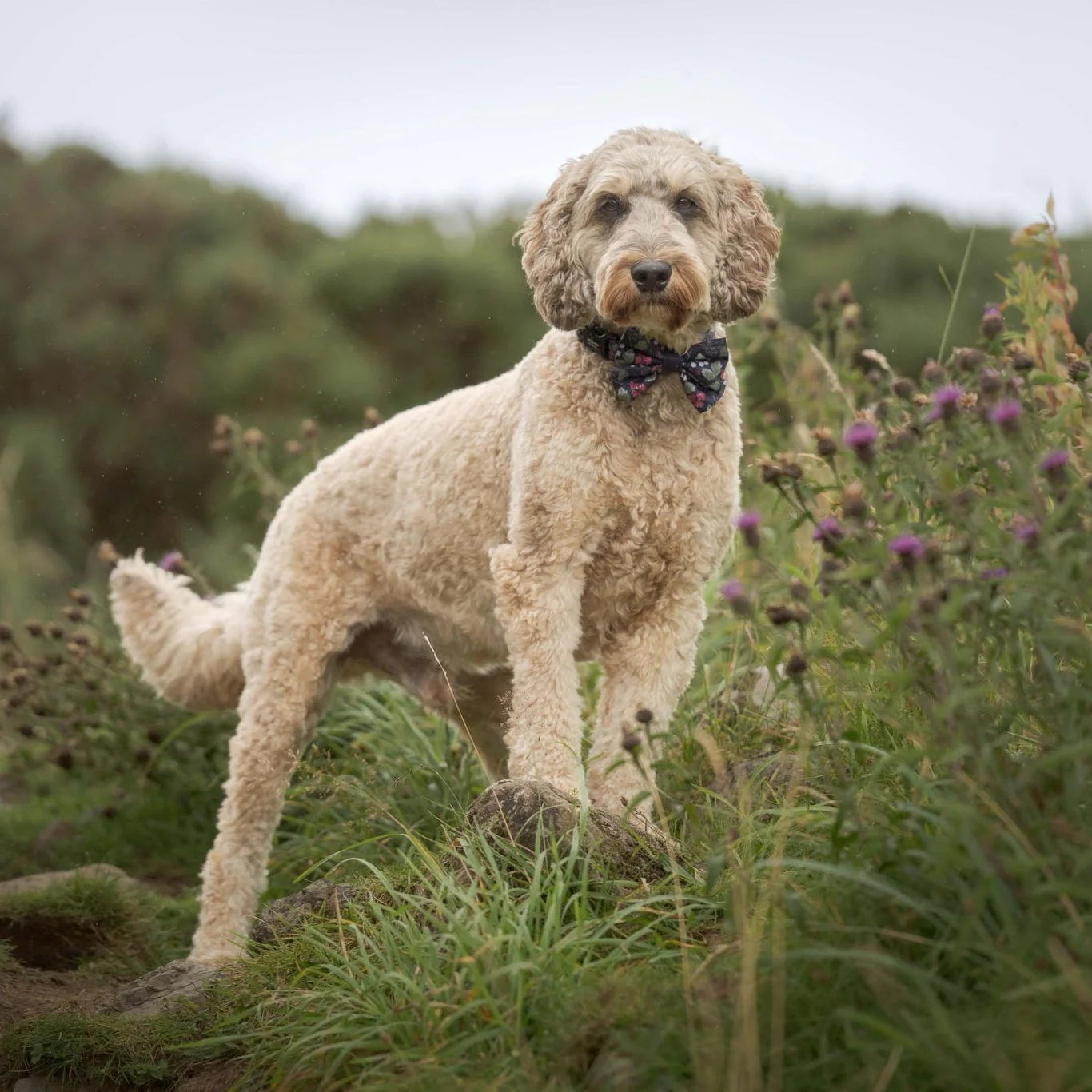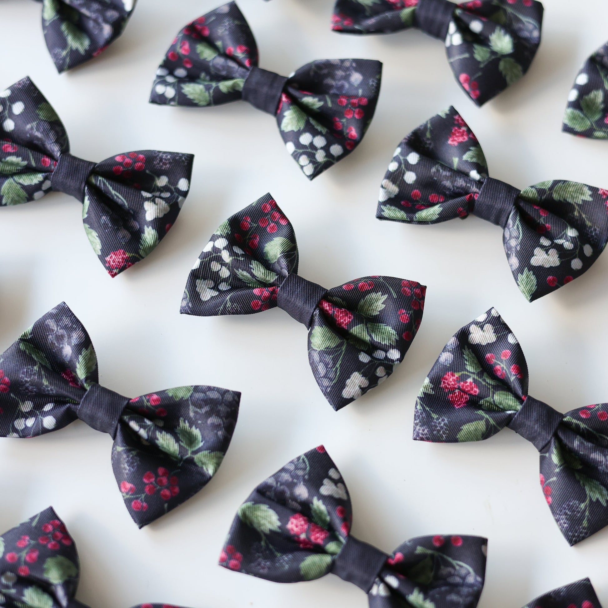 Le nœud papillon Bramble Berry est un classique intemporel. Avec sa base bleu marine profond et son imprimé peint à la main de mûres, de baies sauvages et de feuilles, cet accessoire respire le charme et l'élégance de la campagne . 🌌