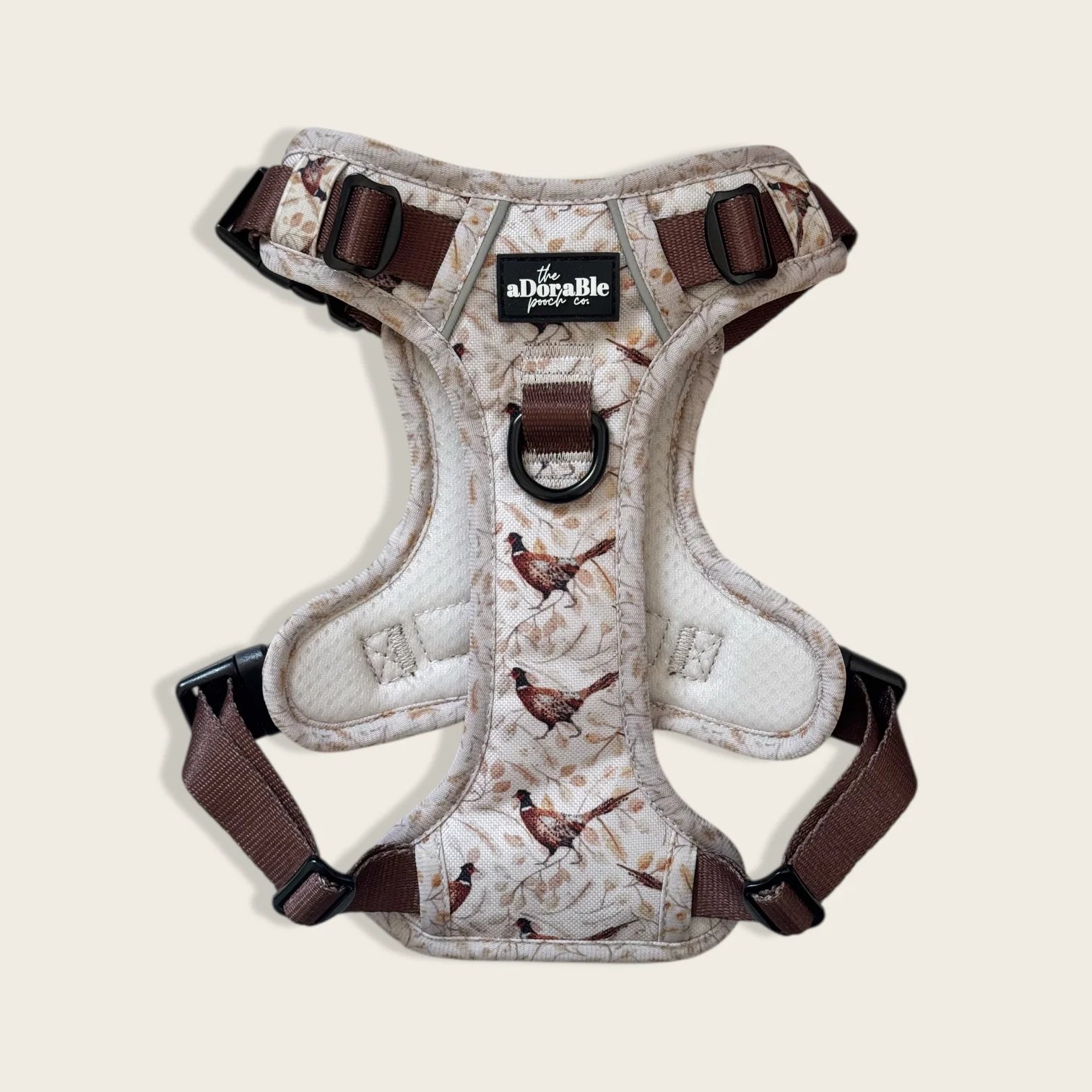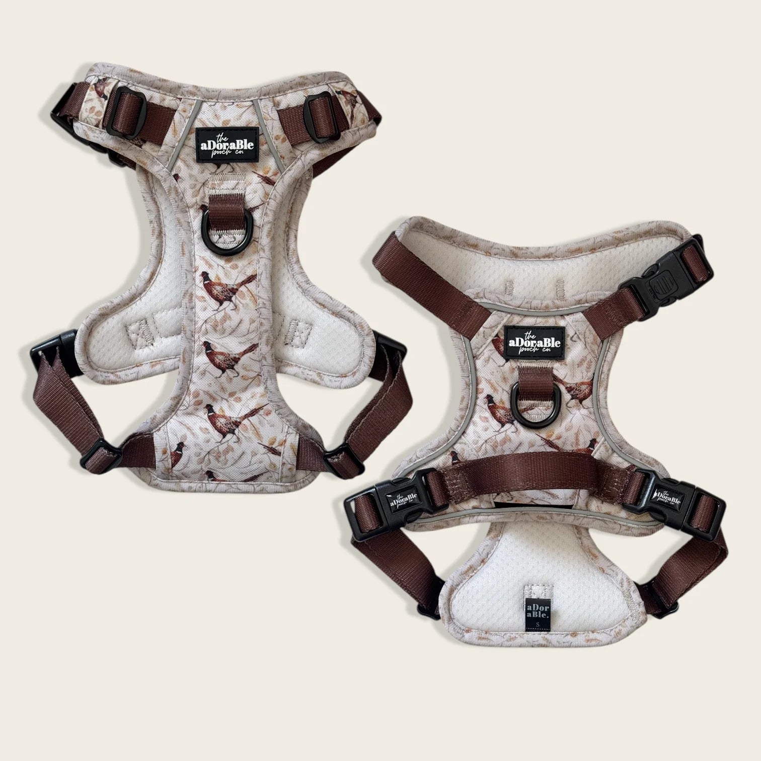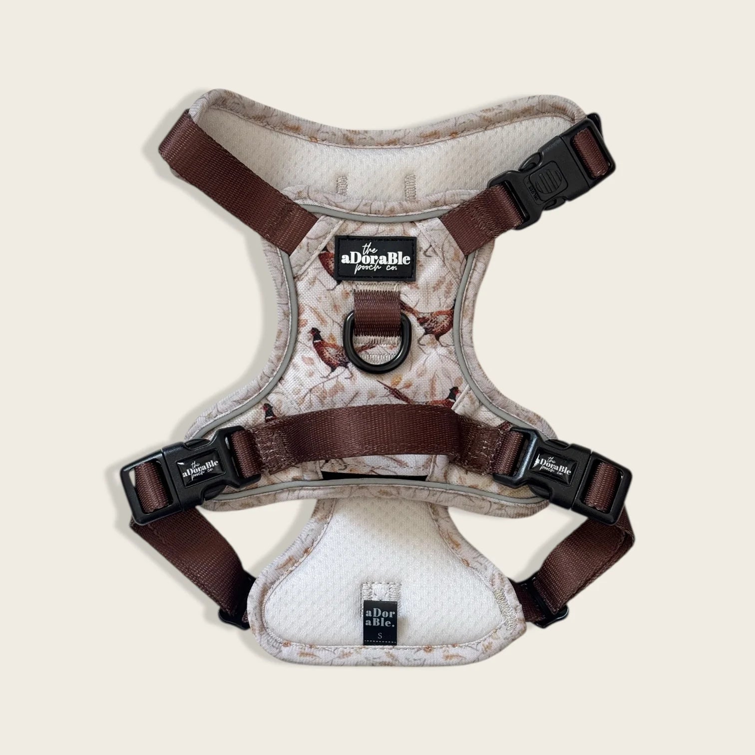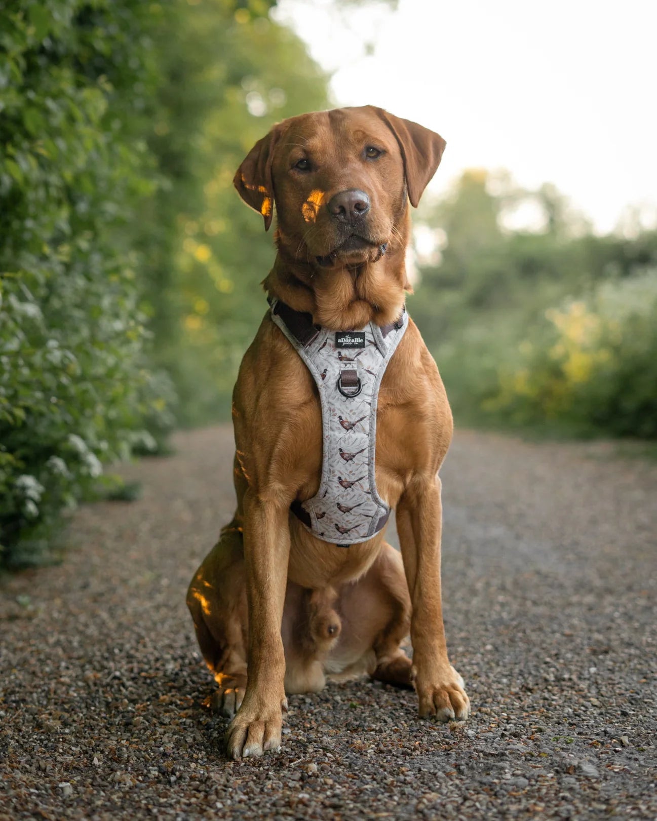 Découvrez le charme rustique du harnais Farmland Pheasant Hike & Go™ de Truf & Peans. Ce harnais pour chien à imprimé faisan s'inspire des vastes champs et forêts de la campagne. Avec ses tons chauds et naturels, ses faisans subtils et ses touches automnales, votre chien arborera une allure élégante et intemporelle à chaque promenade.