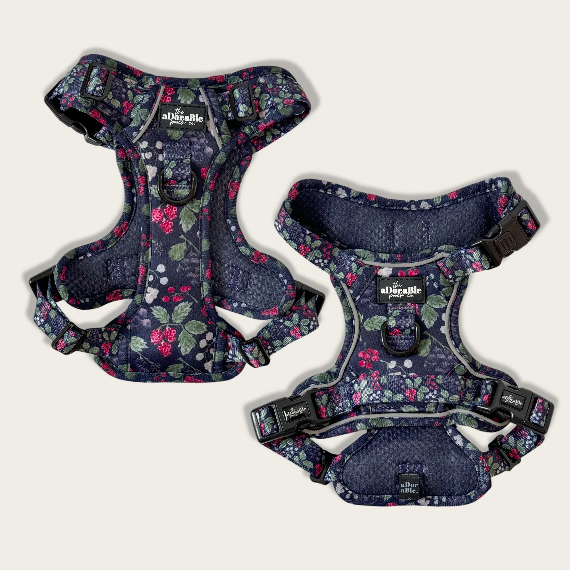 Le harnais pour chien Bramble Berry est un hommage à l'automne. Avec sa base bleu marine profond et ses motifs de mûres, de baies sauvages et de feuilles peints à la main, ce modèle respire l'élégance et le charme champêtre .