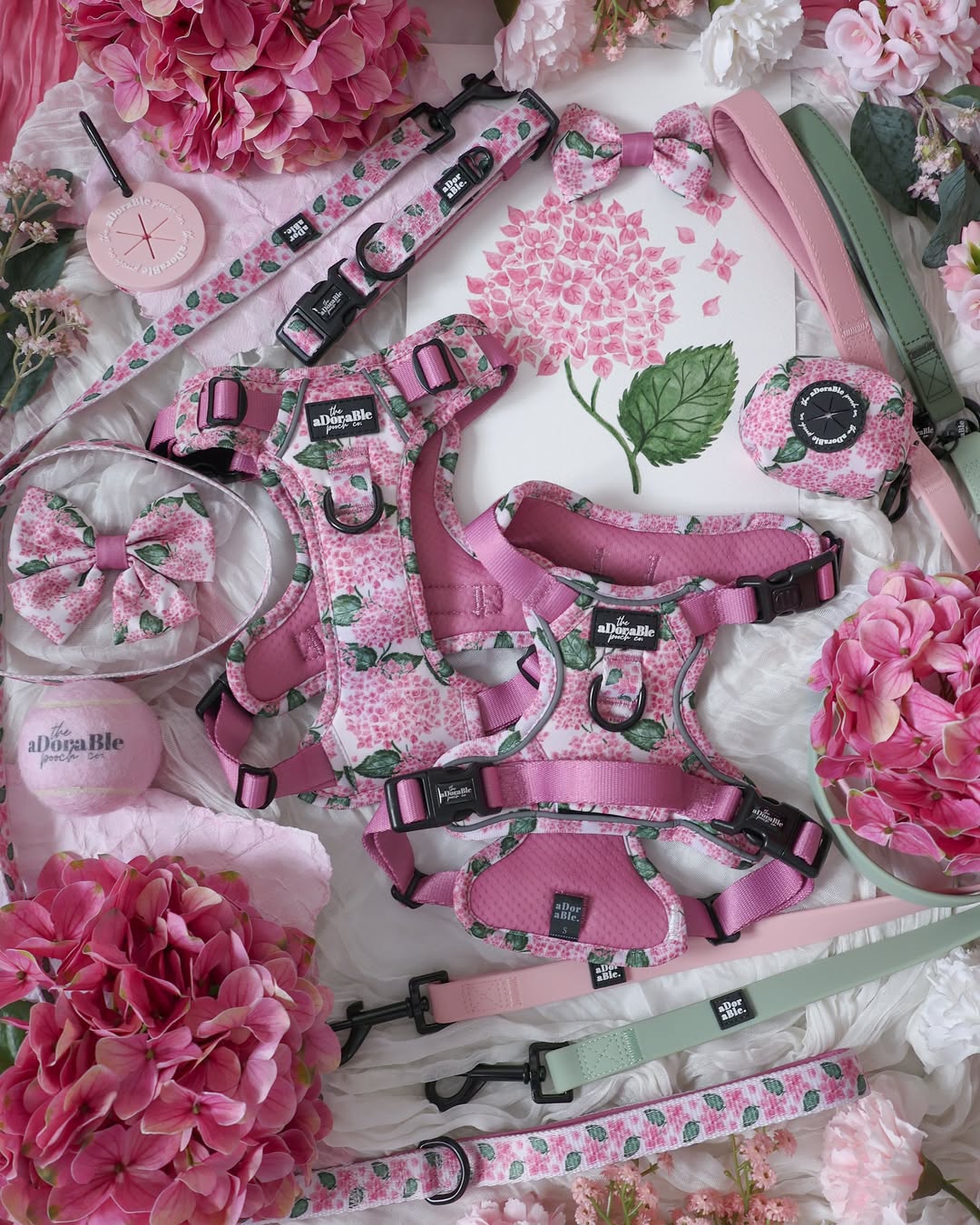 Découvrez la deuxième édition de la collection caritative de The AdoraBle Pooch Co. : le harnais Hydrangea Garden . Ce magnifique imprimé floral rose symbolise la résilience, l'amour et le soutien dans les moments difficiles, et a été conçu pour célébrer la Journée nationale des survivants du cancer .