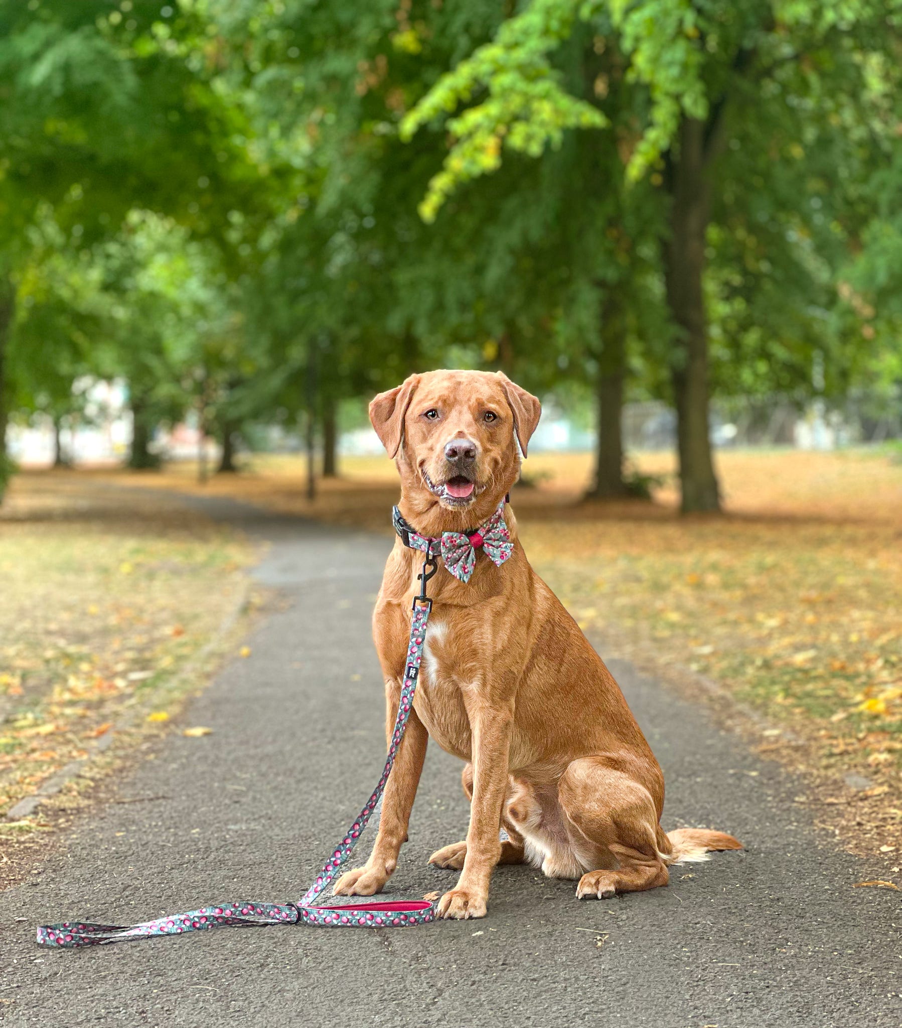 Disponible avec collier, harnais, nœud papillon et porte-sac à crottes assortis