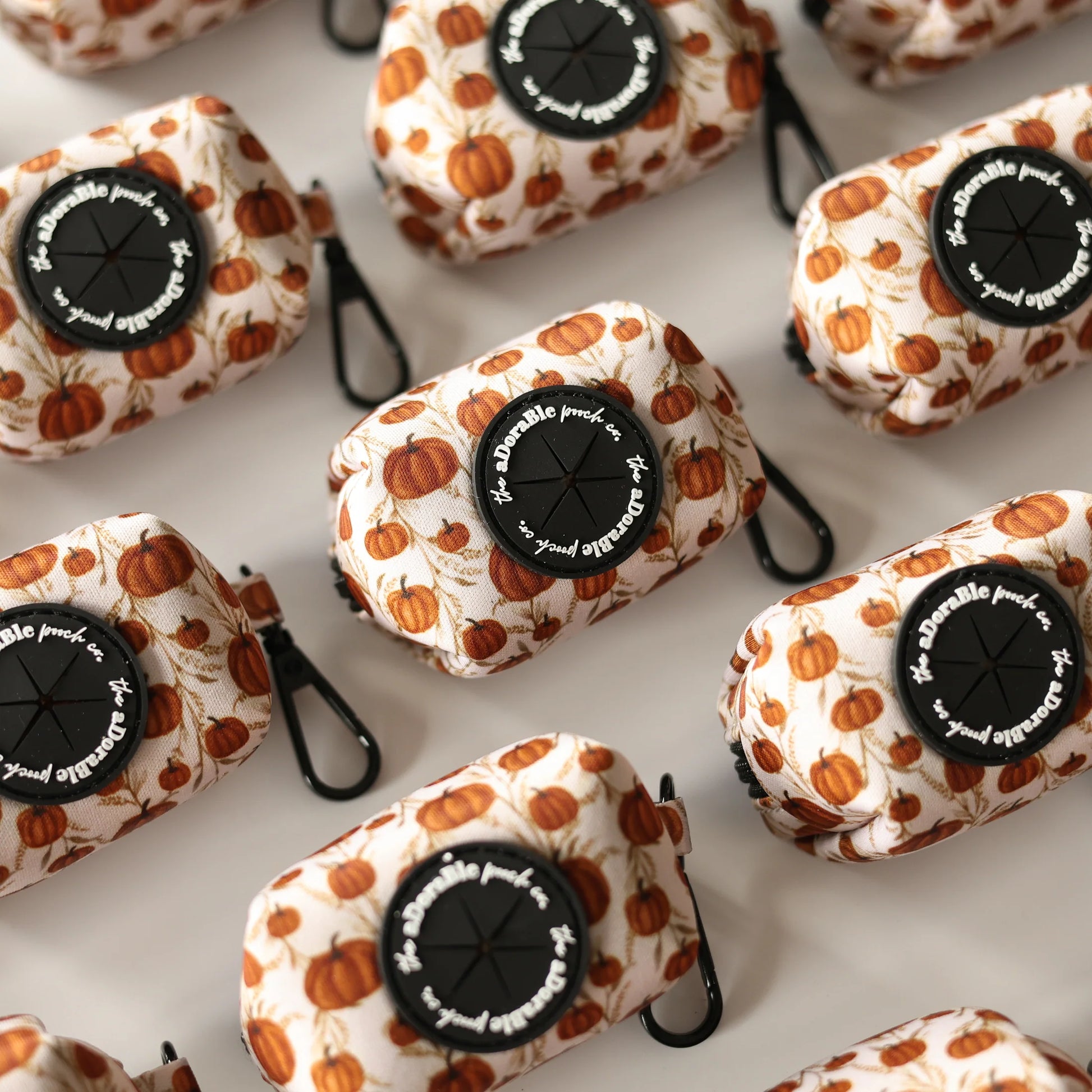 Le porte-sac à crottes Pumpkin Farm allie à la perfection praticité et style. Avec sa base beige douce, ses citrouilles orange et ses touches orange rouille, cet accessoire est parfait pour l'automne.