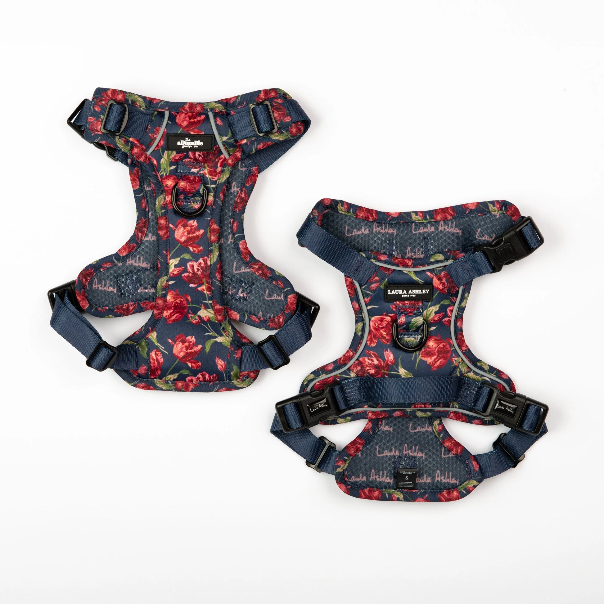 De rijke bloemencompositie en levendige kleuren geven het harnas een elegante en klassieke uitstraling. Het ontwerp brengt de tijdloze Laura Ashley esthetiek samen met praktische hondenaccessoires, zodat je hond zowel comfortabel als stijlvol op pad kan.